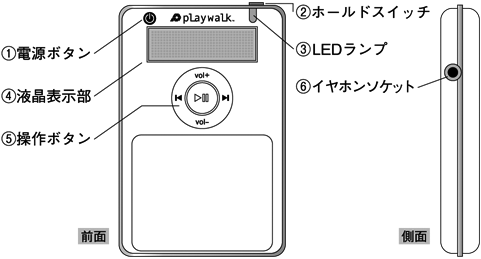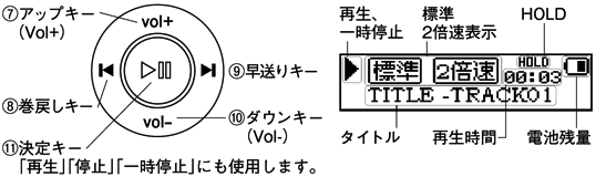 3.「(7)アップキー」「(10)ダウンキー」で再生速度を選択し、「(11)決定キー」を押します。 4.再生速度を選択後、「(11)決定キー」を押すと、再生を開始します。 5.再生を停止する際には、再生中に「(11)決定キー」を押すと再生を停止します。 6.「(1)電源ボタン」を押すと、電源が切れます。 | |||||||||