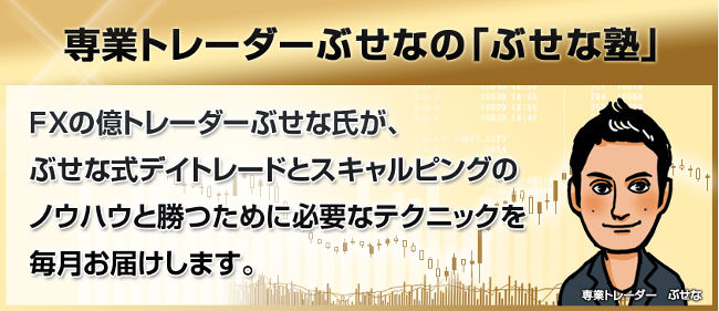 ぶせな式FXトレードを習得するために、ぶせな氏が月に1度講義致します。講義内容はFXの市況に関することや手法にまつわること、また、ぶせな氏が自らのトレードを公開しています。ぶせな氏ほどのトレーダーがトレードを公開する機会は極めて限られていますので、この映像を視聴することで「ぶせな式FXトレード」の早期習得、再現することを目指します。