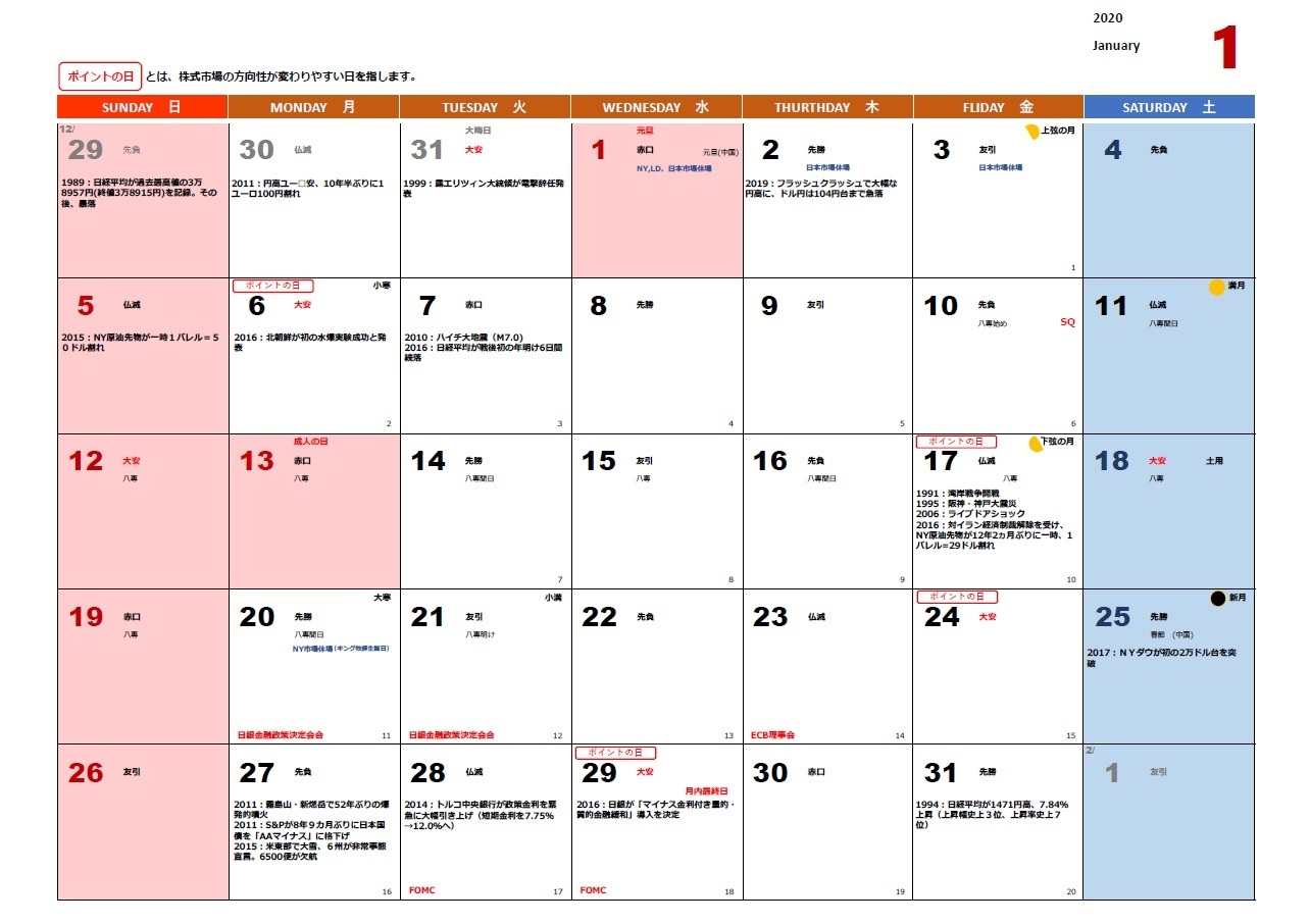 | 源太さんがよく言われる「逆張りカレンダー」として利用しています。核となる株式の売買は、ポイントの日と主要指数平均推移を基準に、自分なりの投資判断を加えて上手くいっています。