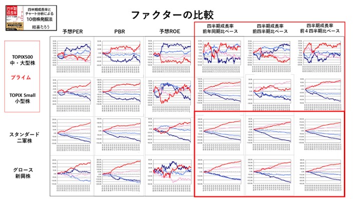 一般的に株価の動きは複雑で、 たとえば好業績で本決算までに同じ成長率を達成した銘柄でも そこで四半期ごとの業績や決算などの成長率を数値化することで、 1. ファクター分析各ファクターを数値化することで、 2. 四半期成長率の5分位分析ファクターを分析したのちに、 たとえばTOPIXでPBRが使えるかどうかを調べる場合は、 TOPIX市場が良いのか、スタンダード市場が良いのか? 3 チャート分析いくら有望銘柄だといっても、 1〜3までを確認できれば、 自分で上昇銘柄をみつけることができるうえ、他の人の注目銘柄を検証することもできます。 ■講座内容(予定)ファクター類のデータベースに関しては、個人では手に入らない専門的なものです