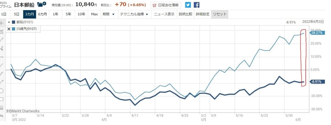 この状況において、ここ2週間で私が行った売買は。前回のブログでも書きました、「日本郵船買い・川崎汽船売り」のさや取りについて、利食いをしています。またRe-openinng(経済再開銘柄)として、9616共立メンテナンスに投資を開始しました。 前回のブログで購入したと書いた4385メルカリについては、これを根玉に、数回つなぎ売りを繰り返したあと売却、現在は保有していません。そしてこれは最も大きな変化ですが、海運株については買い玉をゼロとしたうえで川崎汽船を空売り、現在も売り玉を保有しています。つまり海運株に対するポジションが、180度、方向転換しているということです。 また前回の当ブログで「再度空売りの試し玉を入れています」とした6857アドバンテストは、空売りの本玉を建てています。以上、海運株と半導体関連株については、後述します。 日本株の相場観については、長期的には基本、これまでと変化なしです。前回のブログで、「目先は大きく下落したグロース株が、一時的に戻り相場を至現すると考えます」書きましたが、その展開は先送りになったと考えます。 米国では インフレ懸念の加速、それに対するFRBによる0.75%の利上げが株式市場にネガティブに影響し、株式市場が引き続き軟調な展開。一方で日本株については、 米国株の下落に引きずられている点はありますが、景気敏感バリュー株を中心に、相対的に堅調な動きです。この展開は、今後も続くと考えます。素材株を中心とした市況関連株が一部、弱い動きとなっているようですが、これは期間限定的な動きと考えます。したがって、ここで書いている景気敏感バリュー株が継続して上昇するシナリオは、中長期的には当てはまると思われ、運用スタンスは基本、これまでと変化なしです。 一方で、半導体製造装置株と海運株が下落を開始しましたので、これについては順張り対応、空売りしているということです。 次に8801三井不動産買いと8802三菱地所売りのさや取りについて。 グラフをご覧ください。 ![]() 8801三井不動産買いと8802三菱地所売り(5月20日) ![]() 8801三井不動産買いと8802三菱地所売り(6月3日) ![]() 8801三井不動産買いと8802三菱地所売り(6月17日) 8801三井不動産と8802三菱地所の比較チャート。上が直近株価5月20日時点、中がその2週間後、6月3日時点、その下がさらに2週間後、6月17日時点の両銘柄の過去三ヶ月の比較チャート・相対株価を示したものです。 前回と同様、ここ2週間で目立ったさやの動きは発生していません。従い、両銘柄については、現状は引き続き「待ち」、次の仕掛けのタイミングを待つところと考えます。 一方で、日本郵船買い・川崎汽船売りのさや取りについて。