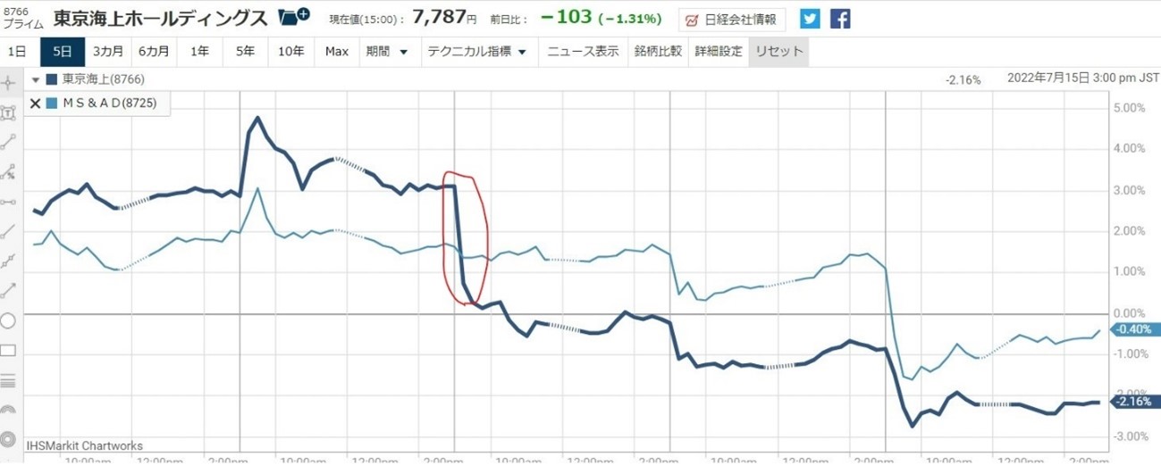 この銘柄の組み合わせの鞘取りを、このブログで紹介するのは初めてでしょうか?私は以前から、何回か仕掛けていたのですが・・・と、時は先週火曜日、7月12日ですね..突然、さやが大きく動きだした。東京海上とMS & ADとのさやが一気に逆転、現在に至っています。