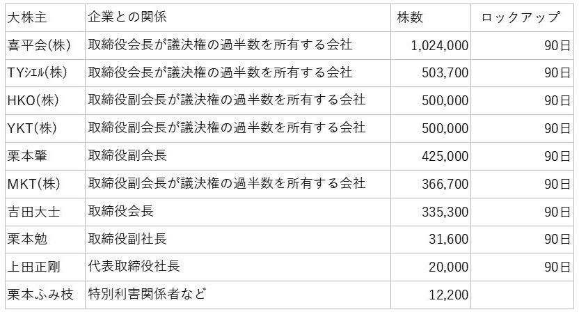 数社のVCが確認できます。各VCには、90日間か公募価格1.5倍以上に株価が値上がりした場合にロックアップが解除される条件が付いています。そのため、公募価格に対して初値が1.5倍以上になった場合は、VCの益出しが発生する可能性がありますので注意が必要です。