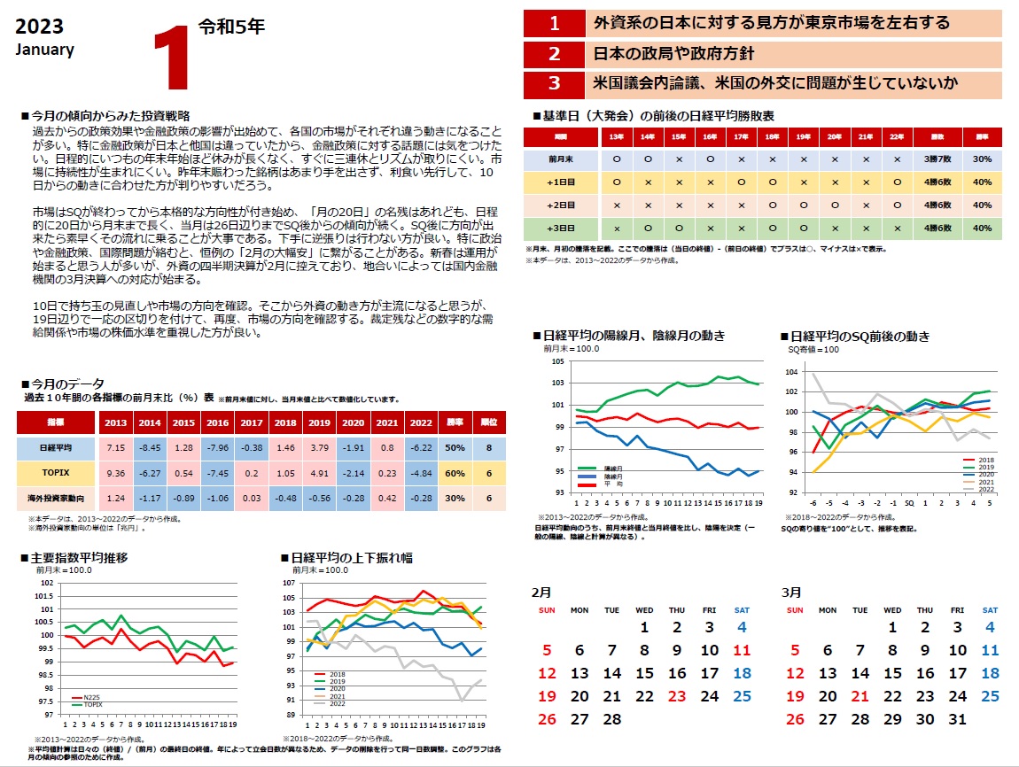 今月の傾向からみた投資戦略、主要指数の過去からの推移グラフ、日経平均のSQ前後の動きなど、市場の見方とデータから対策ができます。