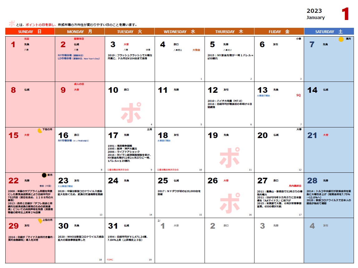 源太独自のポイントの日はもちろん、主要な政治・経済スケジュール、月の満ち欠け、八専などの株にまつわる情報をまとめています。